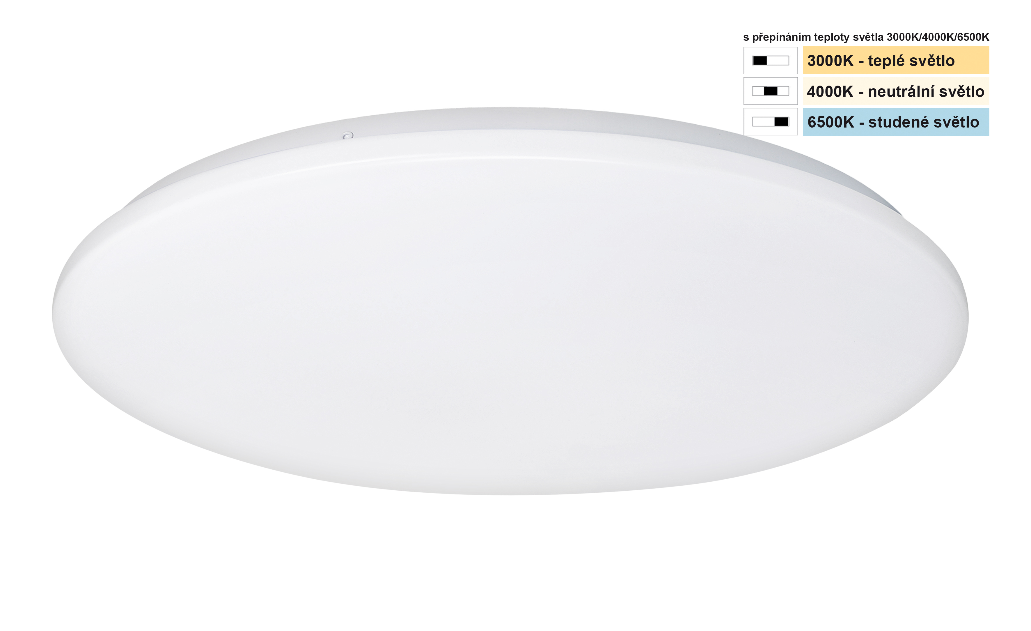 Okrúhle stropné svietidlo Dunaj CCT je vyrobené z kovu a plastu v bielej farbe. Vďaka ochrane IP44 je možné ho umiestniť aj do vlhkých priestorov ako je kúpeľňa, WC alebo balkón a terasa. LED zdroj je zabudovaný a nie je možné ho meniť. Svietidlo má prepínač CCT, je teda možné nastaviť teplotu svietenia na 3000K, 4000K alebo 6500K. Životnosť svietidla je 30000 hodín.