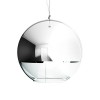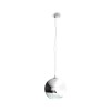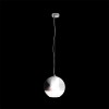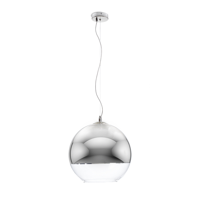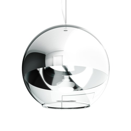 Závěsné svítidlo se stínidlem z ručně foukaného skla. Vzhled stínidla je dosažen speciální metodou, při které je na sklo nanesena tenká vrstva kovu. Spodní část stínidla je ponechána bez chromové úpravy a je z čirého skla. |