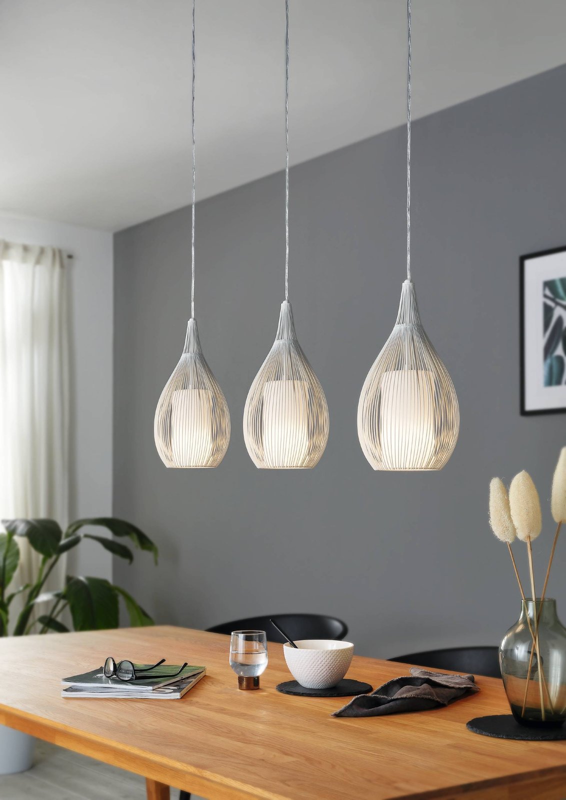 Závesné svietidlá Razoni sú vhodné do všetkých moderných interiérov. Hodí sa nielen do kuchýň a jedální, ale aj do obývacích izieb. Základňa je vyrobená z ocele a tienidlo má zaujímavý tvar kvapky z oceľových drôtov a vo vnútri kvapky je sklenený valec. Po rozsvietení vyzerá svietidlo veľmi efektne. |