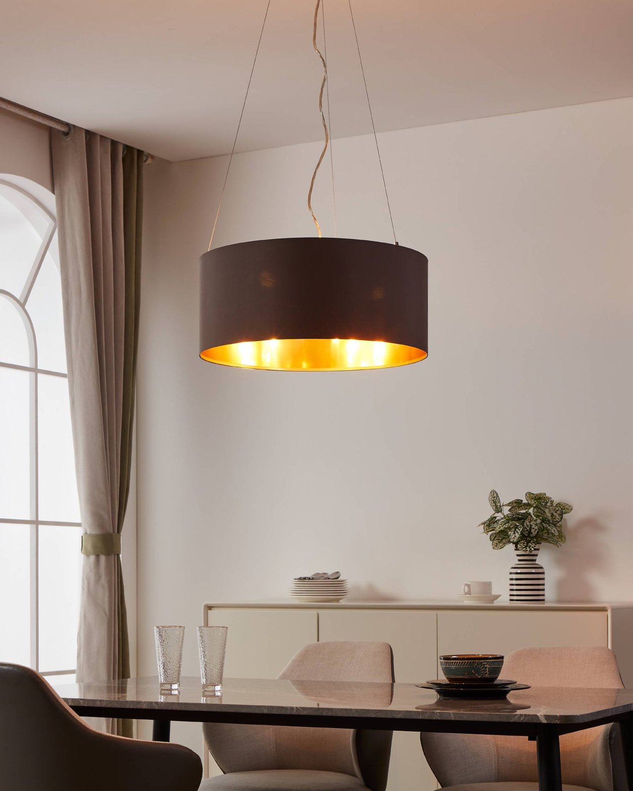 Moderné svietidlá vyrobené z ocele vo farbe matný nikel a tienidlá sú textilné vo farbe cappuccino a zlatá. Sú vhodné do všetkých obytných miestností vo vašom interiéri. Je možné ich osadiť chytrou LED žiarovkou a pomocou aplikácie v smartfóne je stmievať alebo meniť teplotu a farbu svietenia. |
