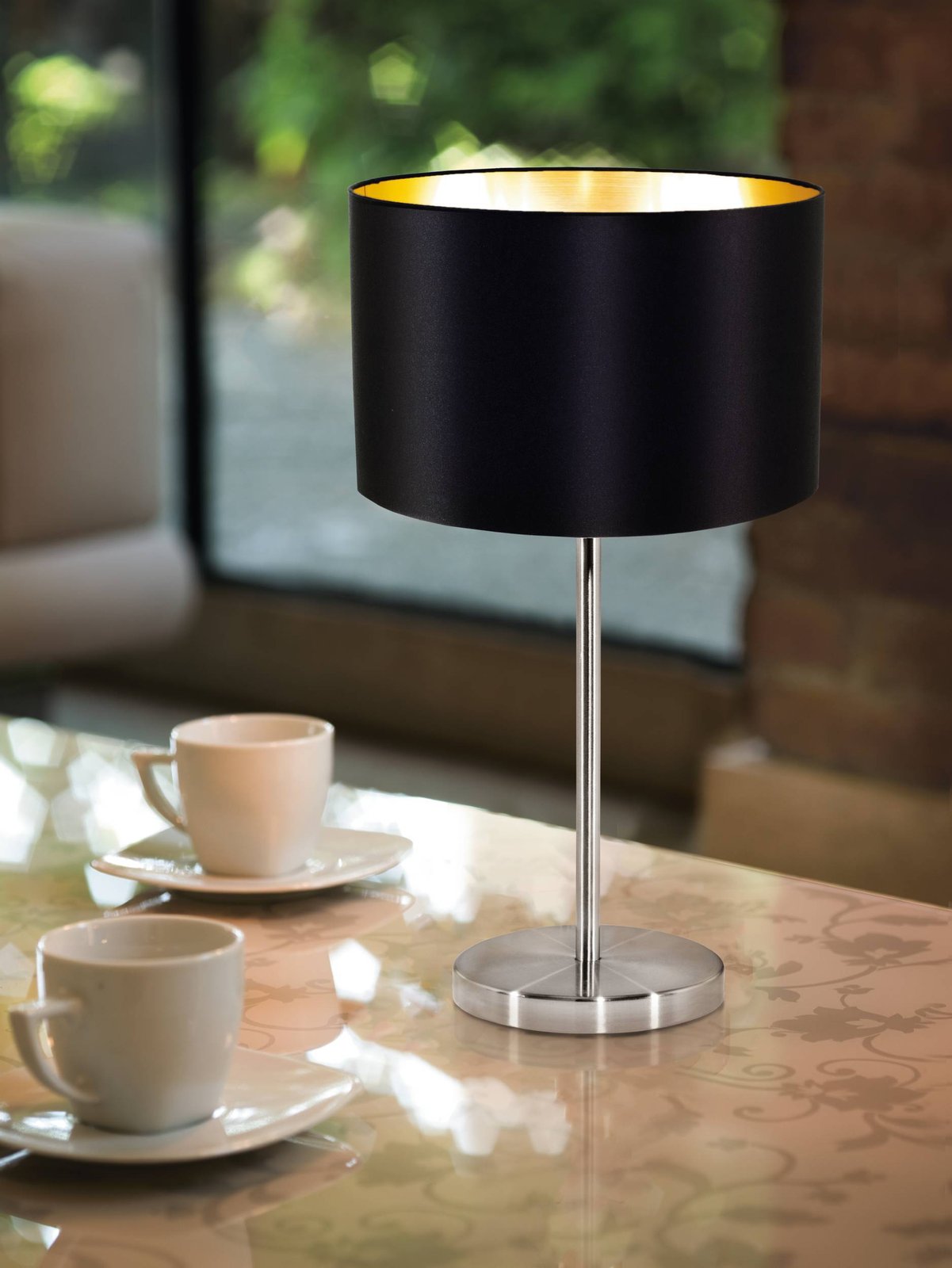 Maserlo sú svietidlá v modernom designe. Sú vyrobené z ocele vo farbe matný nikel a tienidlo je textilné, z vnútornej strany v zlatej farbe a z vonkajšej strany v čiernej farbe. |