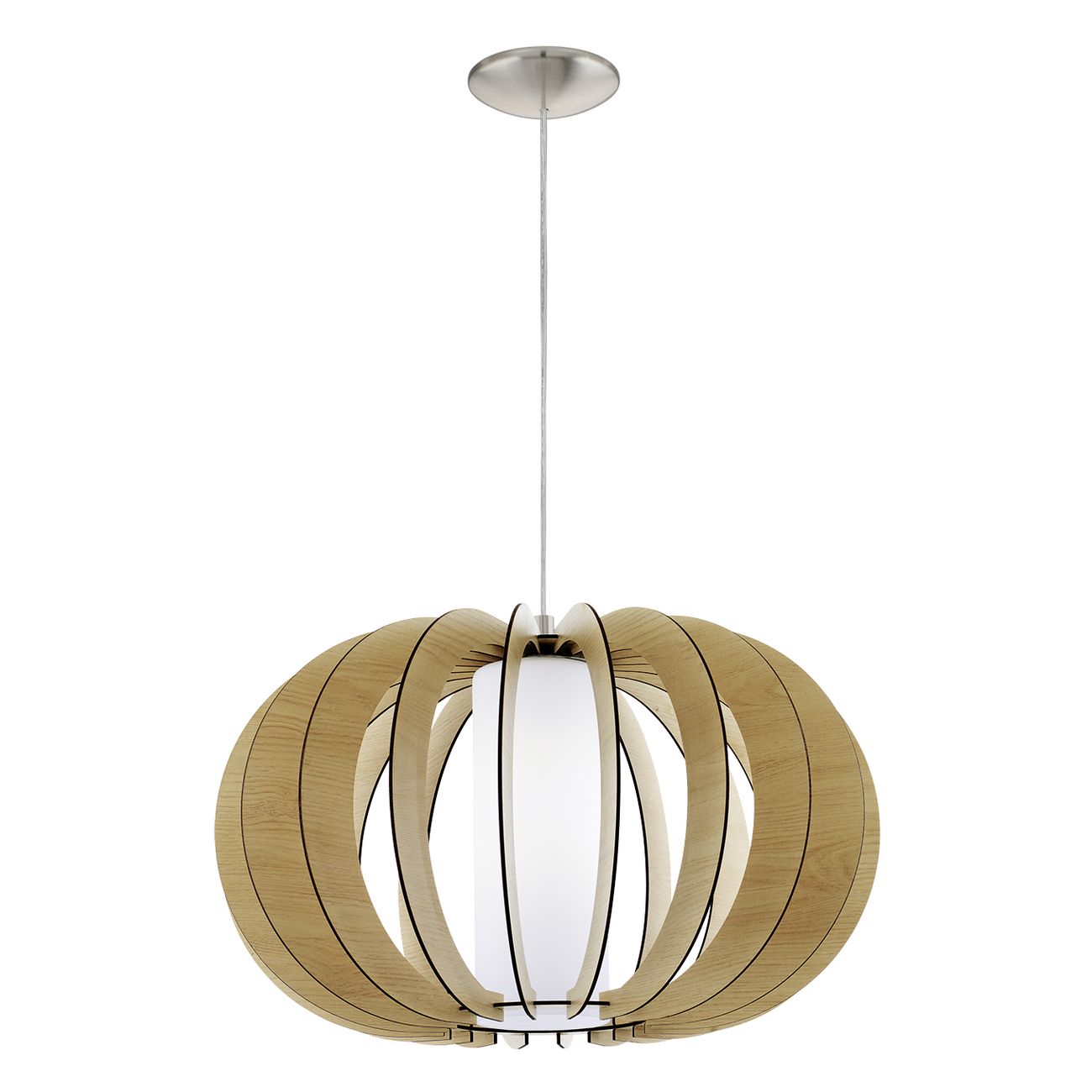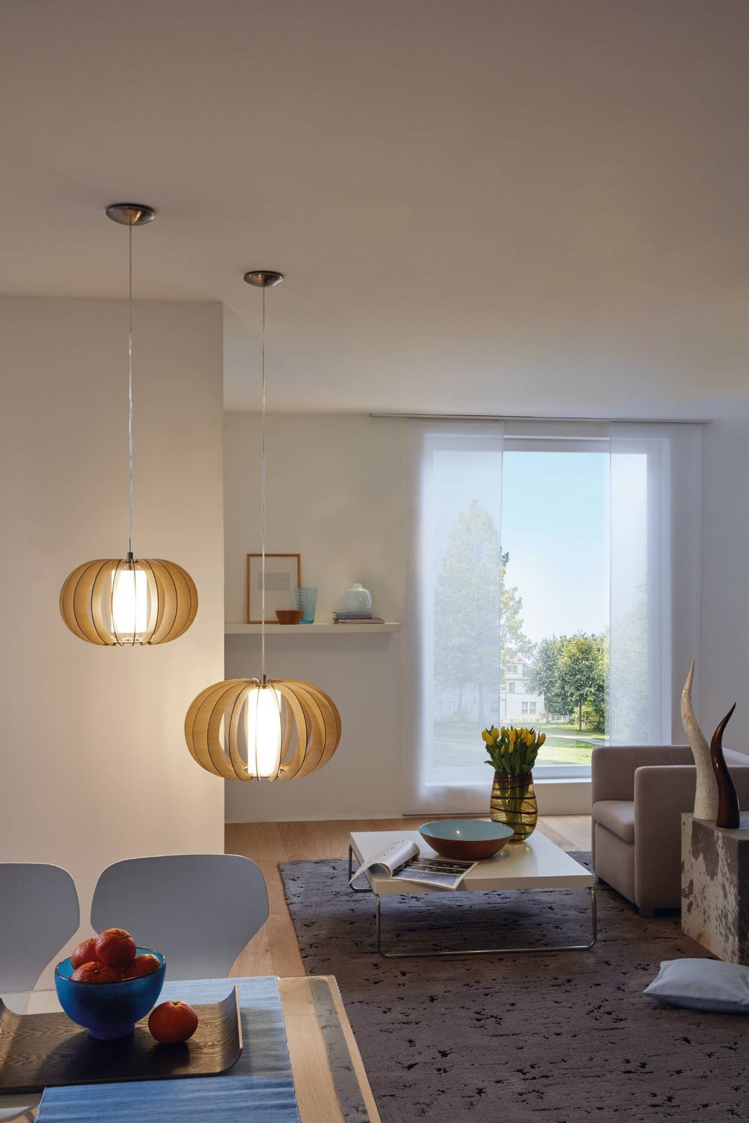 Moderné svietidlá vyrobené z ocele, z dreva vo farbe javora a skla v bielej farbe. Tienidlo tvoria drevené lamely, vo vnútri ktorých je sklenený valec v bielej farbe. Po rozsvietení vytvára zaujímavý efekt, pretože svetlo svieti dole a presvitá aj cez lamely. |