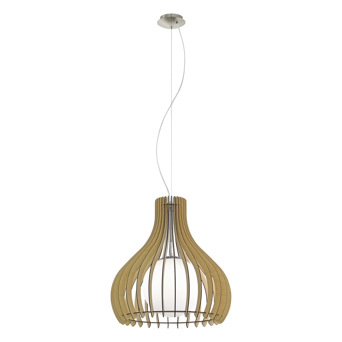 Moderné závesné svietidlá vhodné do obývacích izieb, kuchýň, jedální, ale aj spální a detských izieb. Sú vyrobené z ocele vo farbe matný nikel a z drevených lamiel vo farbe javora. |