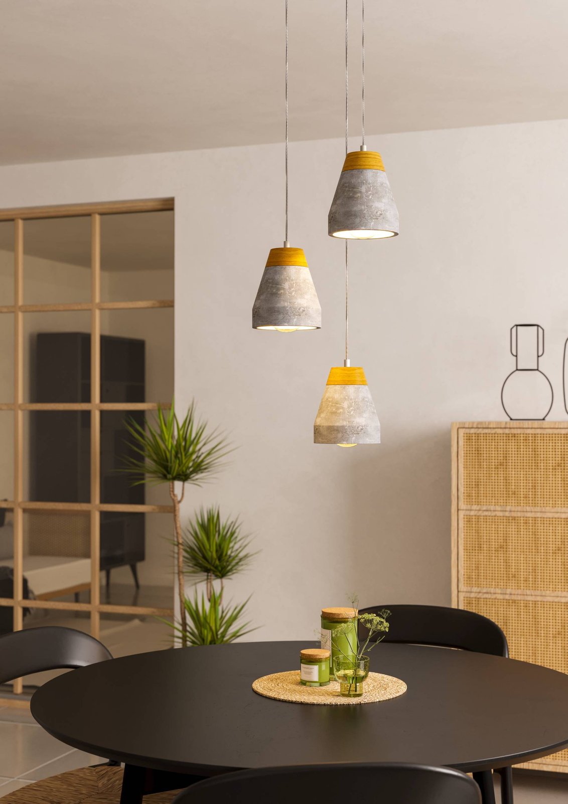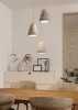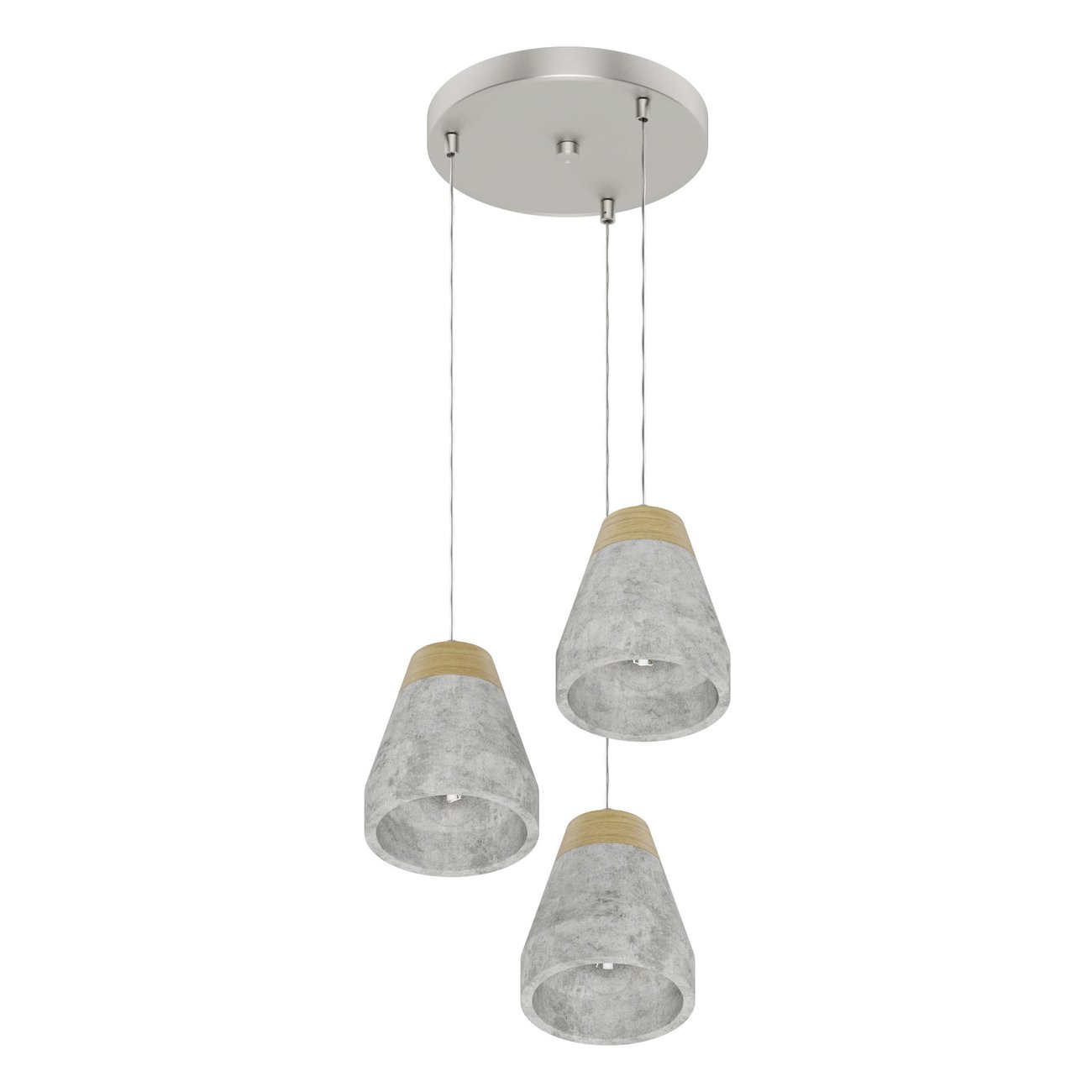 Moderné závesné svietidlá vhodné do kuchýň, jedální i obývacích izieb. Sú vyrobené z ocele v šedej farbe a tienidlo je betónové, v šedej farbe s dreveným hnedým detailom. |