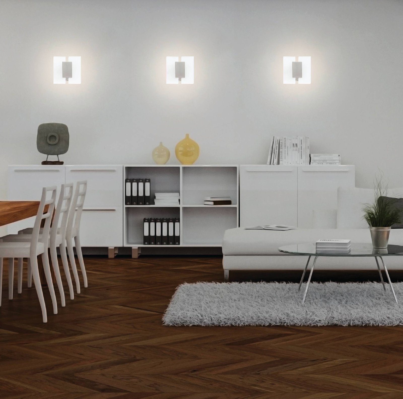 Moderné nástenné svietidlá vyrobené z hliníka a plastu. Svieti teplou bielou farbou a nie je možné ich stmievať.
