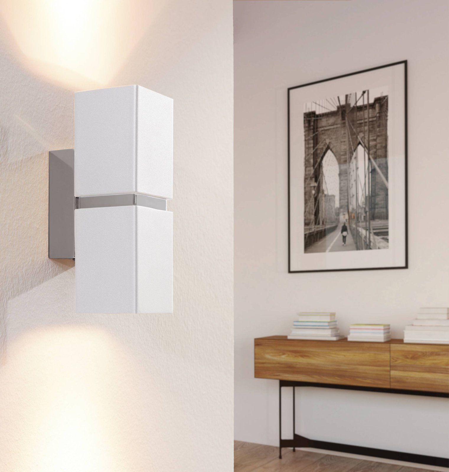 Moderné nástenné svietidlá vhodné na osvietenie chodieb, predsiení, ale aj obývacích izieb a pod. Sú vyrobené z ocele. Svieti náhodu aj dole, čo vyzerá po rozsvietení veľmi efektne. Svietidlá sa dodávajú vrátane žiaroviek so závitom GU10, ktoré svietia teplou bielou farbou, je ale možné dokúpiť chytré LED žiarovky a pomocou aplikácie v smartfóne žiarovky stmievať a meniť teplotu a farbu svietenia. |