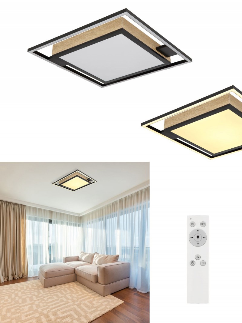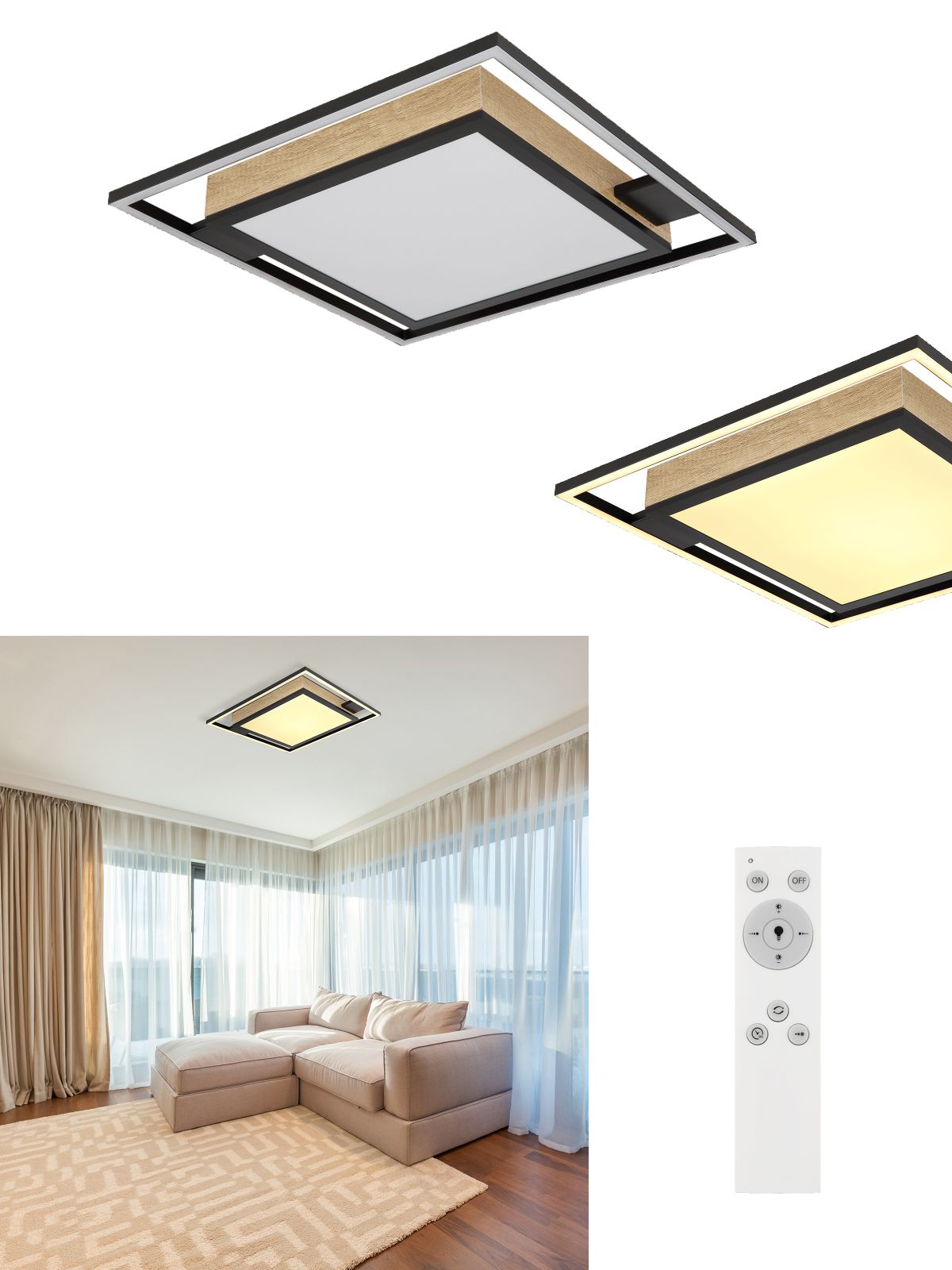1. GL-67283-40 Stropní svítidlo kov černý matný, MDF imitace dřeva, akryl bílý, stmívatelné, několik úrovní pomocí nástěnného spínače, paměťová funkce, noční světlo, časovač, dálkové ovládání, Dx?xV:400x400x60mm, LED 40W 230V, 230-2300lm výstup, CCT 2700-6500K detail výrobku
