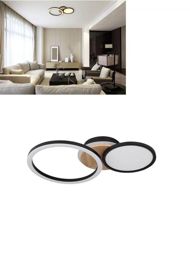 Dizajnové stropné svietidlo kruhového tvaru vyrobené z kovu v elegantnej matnej čiernej farbe, z MDF v imitácii dreva a z plastu v opálovej farbe. Hodí sa do obývacích izieb, spální, chodieb a predsiení. Svieti teplou bielou farbou. |