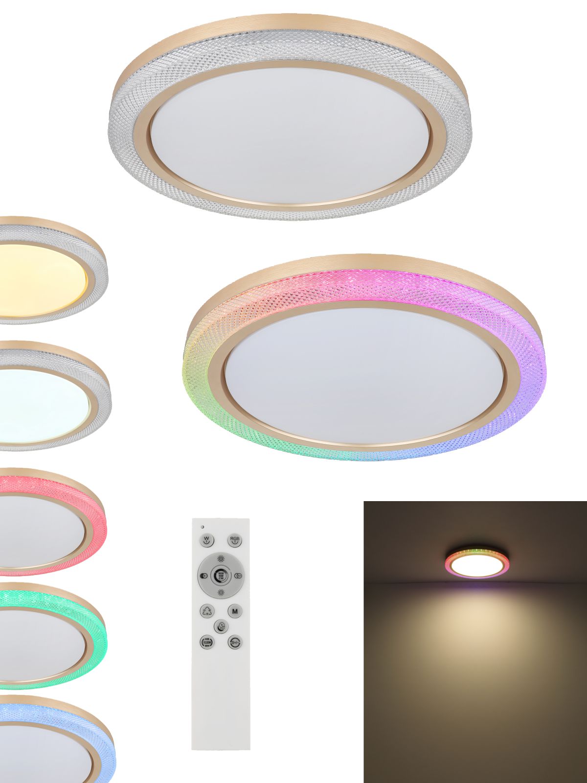 1. GL-41372-24 Stropní svítidlo kov bílý, zlatá, plast bílý, stmívatelné, několik úrovní pomocí nástěnného spínače, RGB duhový efekt, paměťová funkce, noční světlo, časovač, dálkové ovládání, Ø:505mm, V:75mm, LED 20W+5W RGB 230V, 65-1100lm výstup, CCT2700-6500K detail výrobku