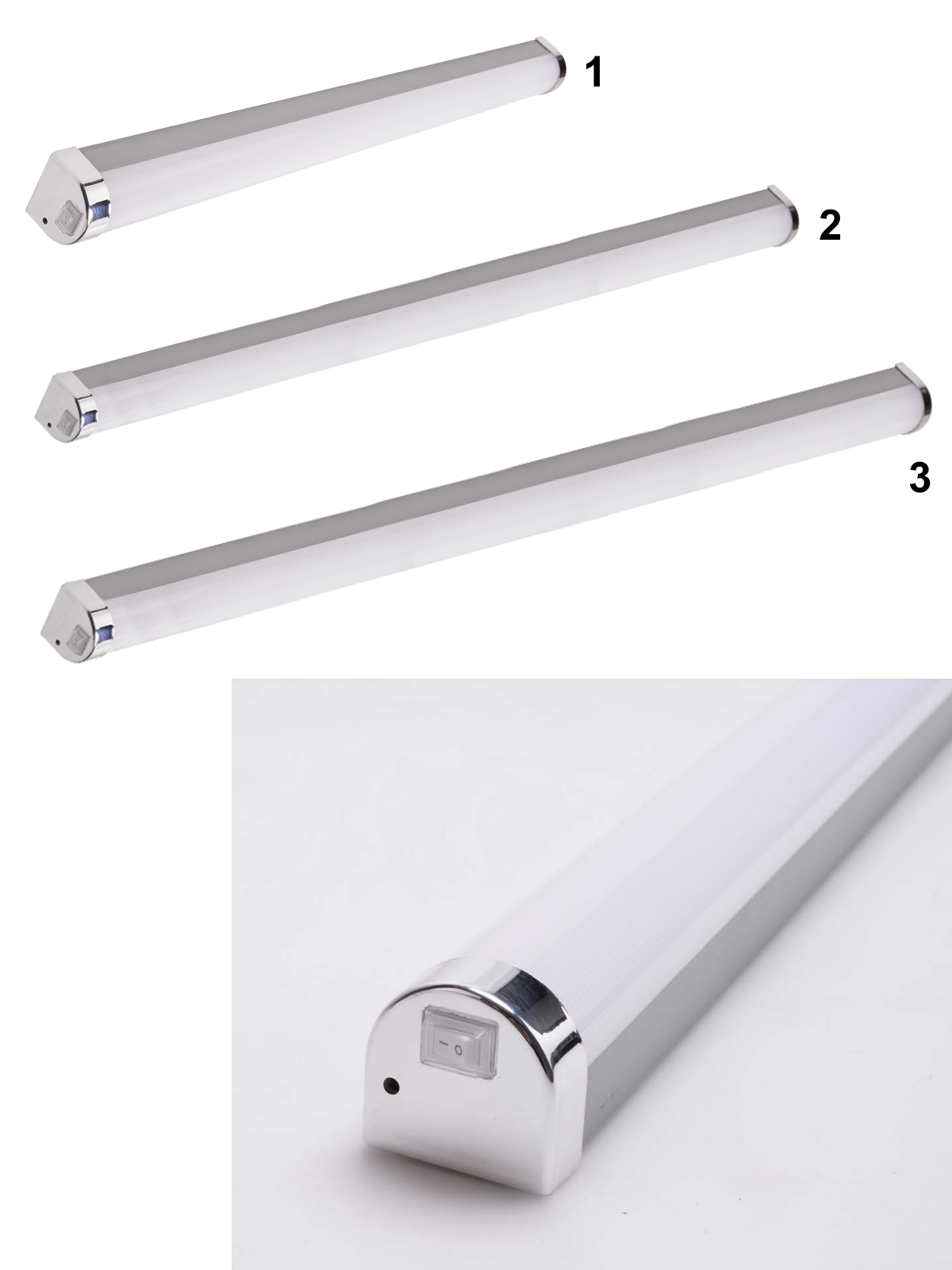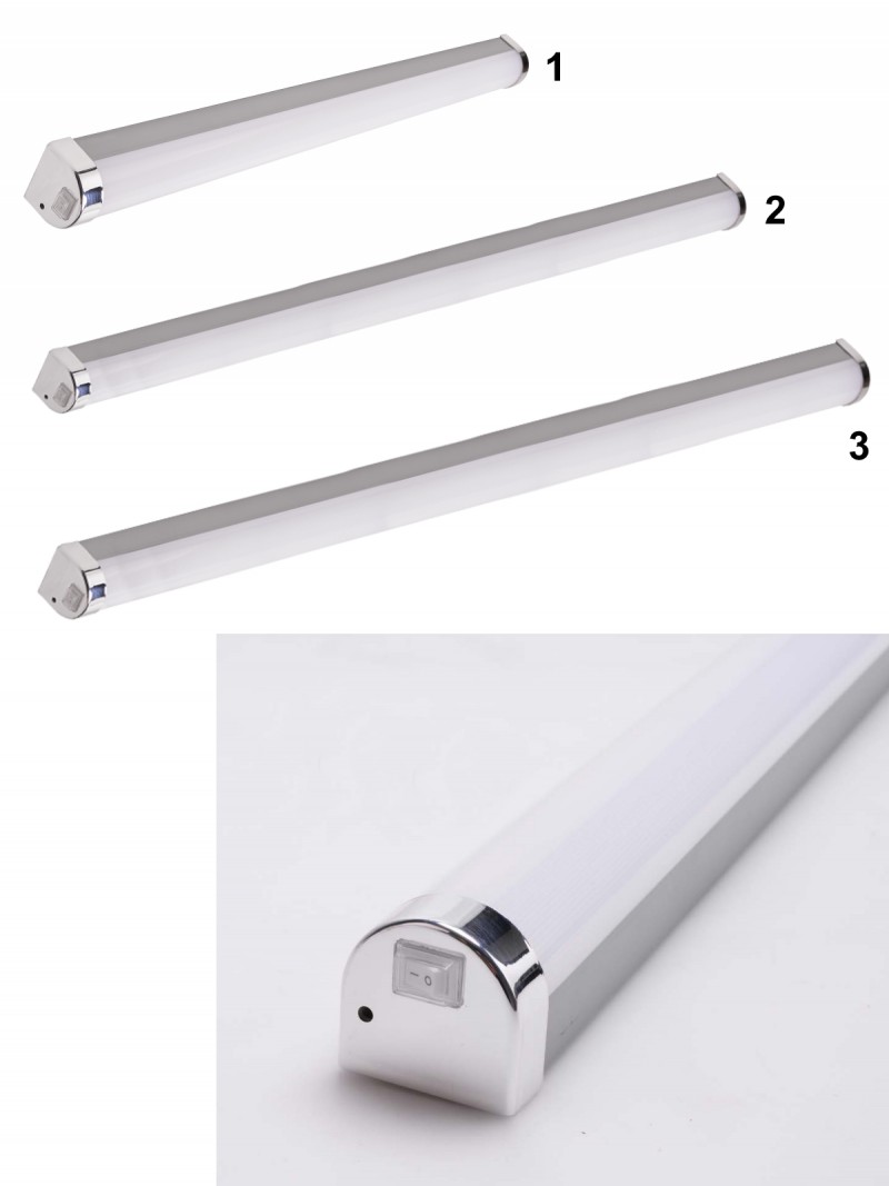 Kúpeľňové svietidlo nad zrkadlo vyrobené z plastu v chrómovej farbe a z akrylu v bielej farbe. S vypínačom. |
