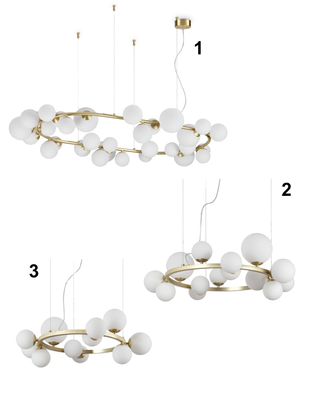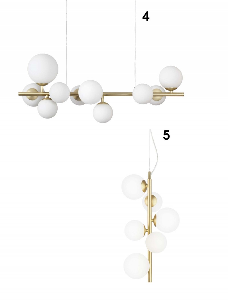 Moderné lustre vyrobené z kovu v mosadznej farbe, tienidlá tvoria biele sklenené gule. Sú vhodné do obývacích izieb, kuchýň, jedální, spální a pod. |