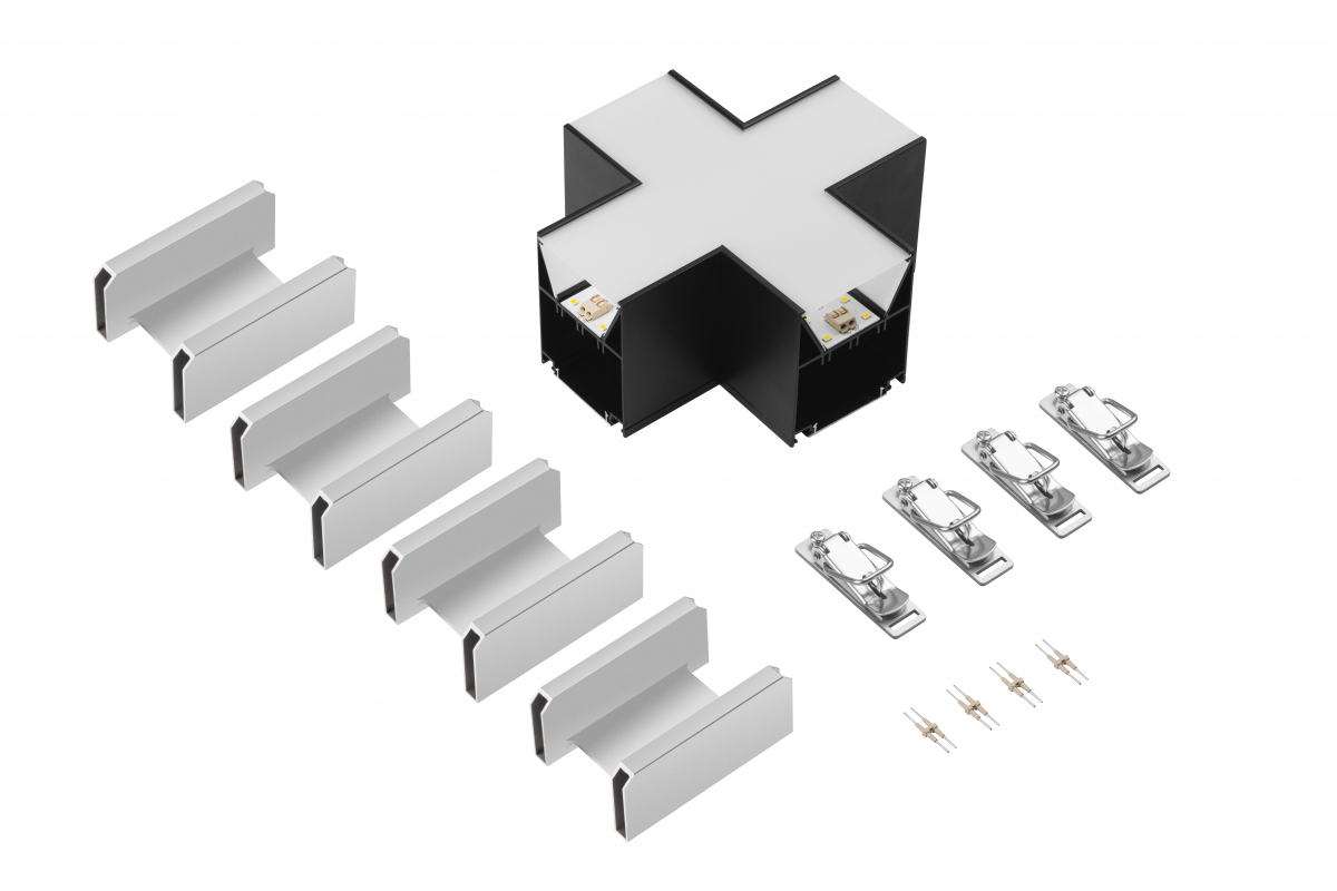 X-konektor umožňuje pripojenie svietidiel v pravom uhle. Súprava obsahuje štyri spony a štyri kolíkové konektory, ktoré zabezpečujú stabilné a pevné pripojenie. Ideálna voľba pre tých, ktorí hľadajú efektívne a estetické riešenia osvetlenia.