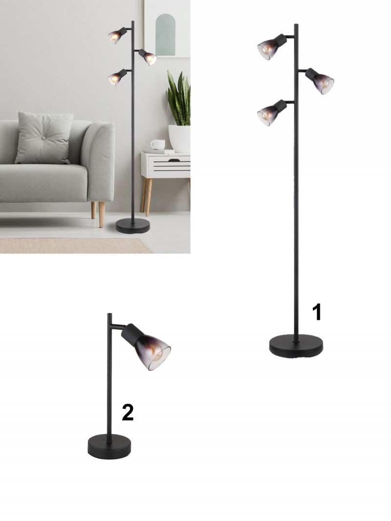 1. GL-54312-3S Stojací svítidlo, kov černý matný, sklo kouřové a průhledné, kabel PVC černý, vyínač na kabelu, Dx?xV:300x220x1610mm, délka kabelu 1800mm, bez žárovek 3xE14, max. 25W 230V detail výrobku