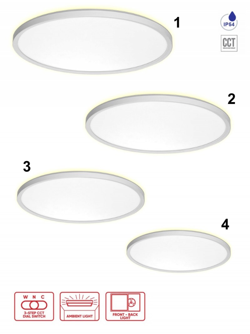 Moderné okrúhle svietidlo na strop z plastu v elegantnej bielej farbe. Vďaka IP54 ochrane sa hodí aj do vlhkého prostredia ako je kúpeľňa, toaleta alebo terasa. Nastavenie teploty svietenia 3000-6000K. |