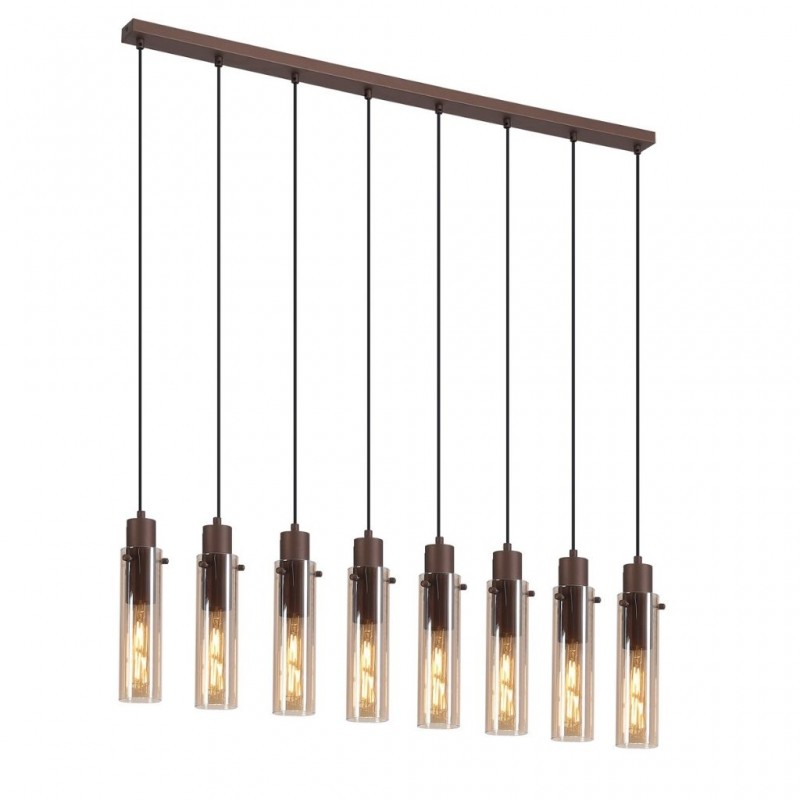 Závesné svietidlo Searchlight kávovej a jantárovej farby, povrchová úprava matným práškovým lakom, použitý materiál je mäkká oceľ a sklo. Rozmery v cm: celková výška: 120, výška: 32, šírka: 7, dĺžka: 110, výstupok: 0. Zdroj svetla s päticou E27, potrebných je 8 žiaroviek, zdroj svetla nie je súčasťou dodávky, výrobcom odporúčaný typ žiarovky je klasická žiarovka pre max. 60 W. |