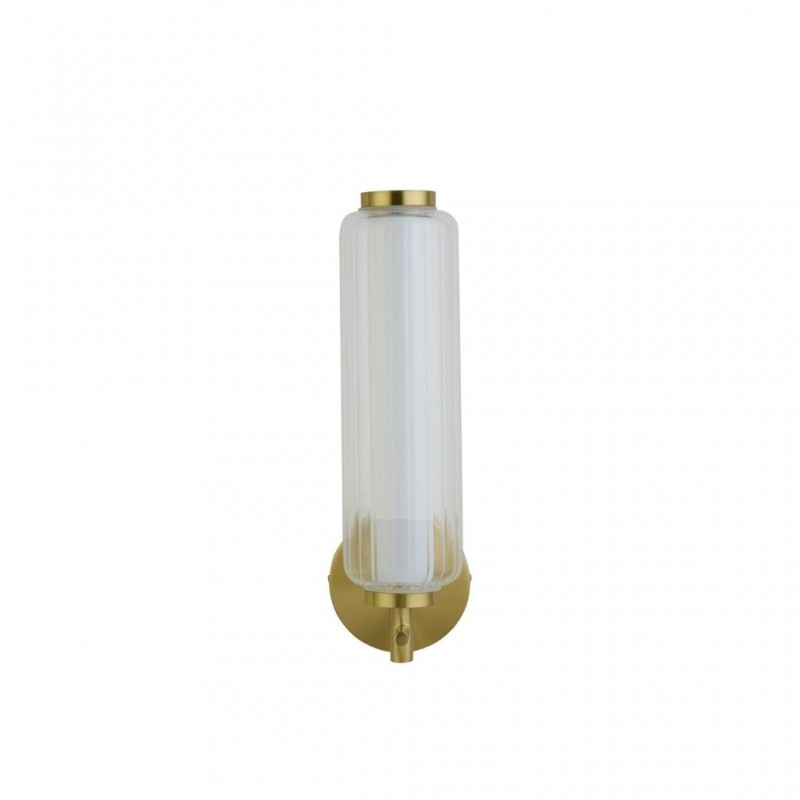Vyhľadávacie nástenné svietidlo mosadznej a čírej farby, povrchová úprava matné pokovovanie, použitý materiál je sklo a kov. Rozmery v cm: celková výška: 32, výška: 32, šírka: 10, dĺžka: 0, výstupok: 14. |