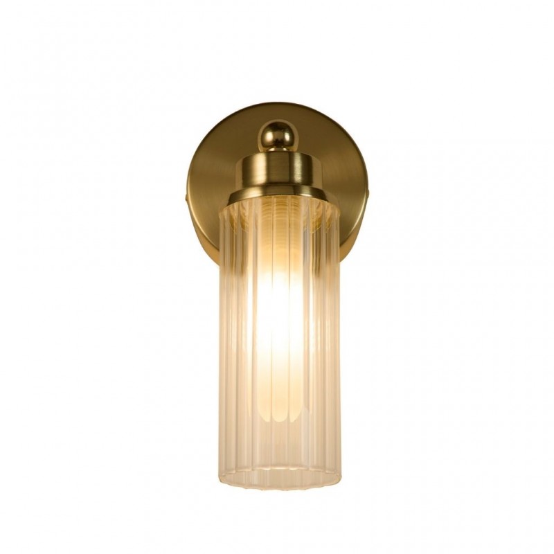 Vyhľadávacia nástenná lampa farba matná mosadz a číre rebrovanie, povrchová úprava matná, použitý materiál je sklo a kov. Rozmery v cm: celková výška: 22, výška: 22, šírka: 10, dĺžka: 0, výčnelok: 12. Pätica svetelného zdroja G9, potrebné žiarovky 1, svetelný zdroj nie je súčasťou dodávky, výrobcom odporúčaný typ žiarovky je G9 pre max. 7 W. |