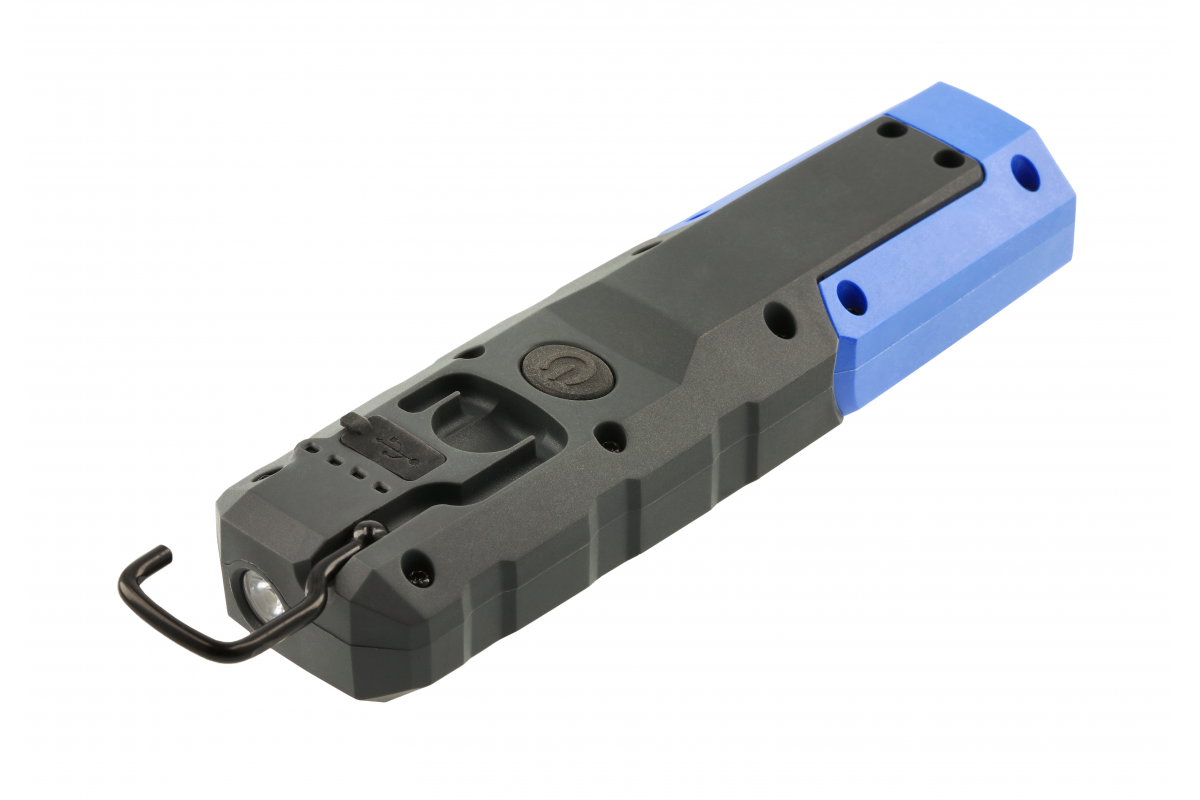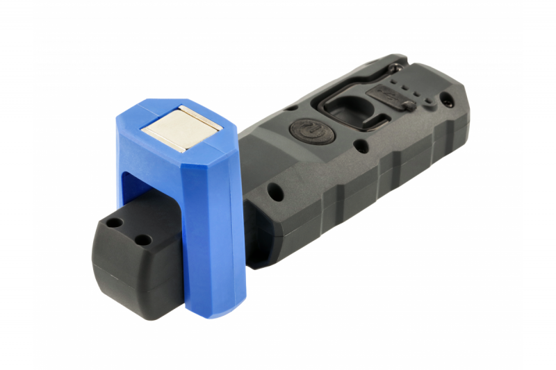 Silný magnet a sklopný hák umožňují svítilnu upevnit a mít volné ruce pro práci.