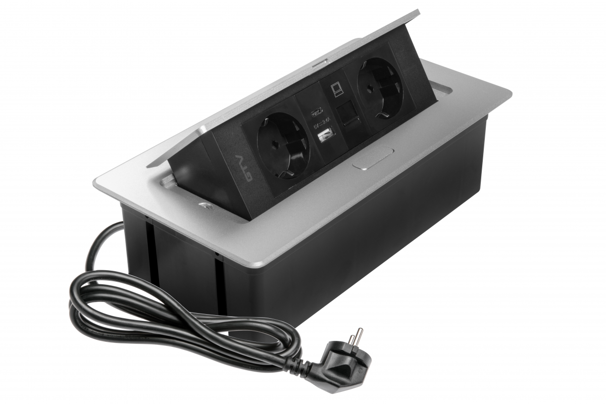 MULTISOFT nábytková zásuvka 2x zásuvka Schuko, USB A+C, RJ45, napájecí kabel se zástrčkou, hliník - Doplnkový sortiment