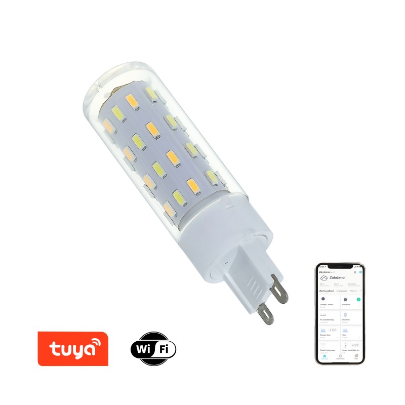Technická specifikace: Protokol: Wi-Fi, Bluetooth Frekvence: 2400MHz~2483.5MHz Maximální RF výstupní výkon WiFi: 16dBm Maximální RF výstupní výkon Bluetooth: 20dBm Příkon: 4W Síťové pohotovostní napájení (Pnet): 0,2W Patice: G9 Materiál těla žárovky:plast Barva světla: CCT Barevná teplota: 2700K-6500K Světelný tok: 400lm (v kouli 360°) Úhel světelného paprsku: 360° Vstupní napětí: AC 230V, 50/60HZ Průměrná životnost: 25.000 hodin Index podání barev:>80Ra Rozměry: 1,8cm x 7,2cm Odpovídá klasické žárovce: 40W Počet spínacích cyklů: 100.000 Okamžité rozsvícení Účiník (Power factor): >0.5 Možnost stmívání: ANO Certifikáty: CE