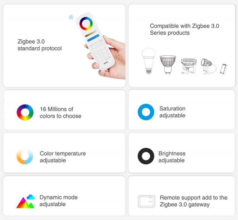 Ovladačem je možné stmívat, vypínat, měnit teplotu bílé barvy světla a barvy RGB světelných zdrojů komunikující na potokolu ZigBee 3.0. Technická specifikace: Kompatibilita: iOS, Android, Amazon Alexa, Apple Siri zkratky, Google Assistant, Philips HUE, TUYA, Tahoma, Lidl, Ikea. |