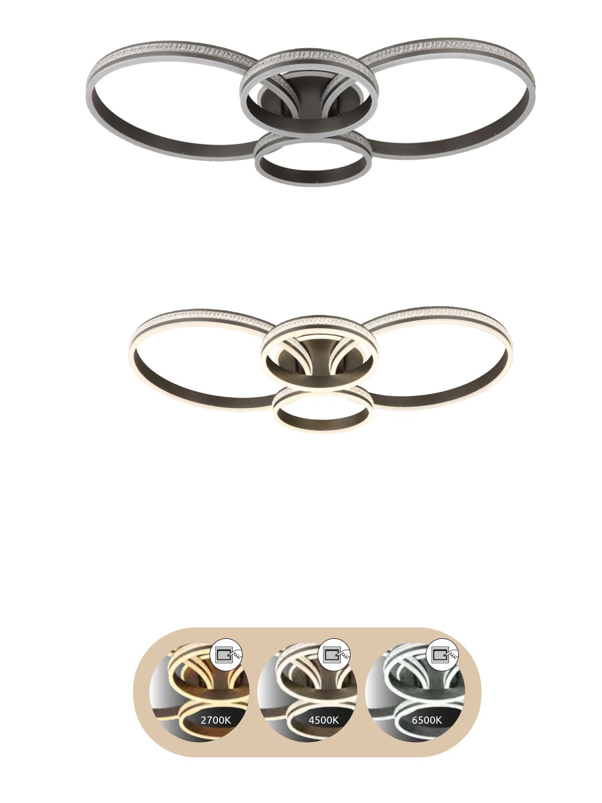 Moderné stropné svietidlo Grouni LED je vyrobené z kovu v matnej titánovej farbe, s čírymi plastovými krištáľkami. Vďaka CCT je možné pomocou vypínača na stene nastaviť teplotu svietenia na 2700K/450K alebo 6500K na vytvorenie príjemnej atmosféry v interiéri. Má tiež funkciu pamäte posledného nastavenia. |
