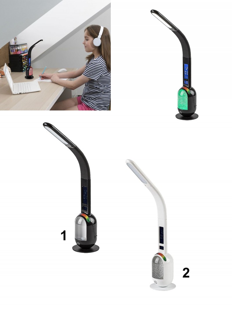 Táto moderná lampa je celá vyrobená z plastu, doplnená dekoratívnou základňou v tvare disku. Rameno lampy je tenké a ploché, s dvoma displejmi v spodnej časti. Okrúhla časť konštrukcie, ktorá sa dotýka dekoratívnej základne, je naplnená tekutým sľudovým materiálom – táto časť je samostatne spínateľná. Lampa umožňuje RGB osvetlenie, vďaka čomu môže sľudová výplň svietiť rôznymi farbami. |