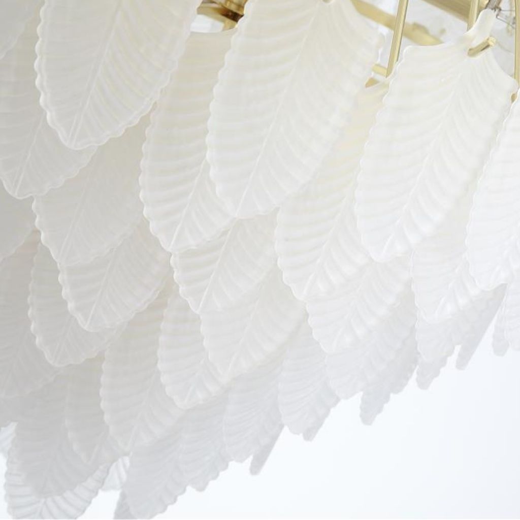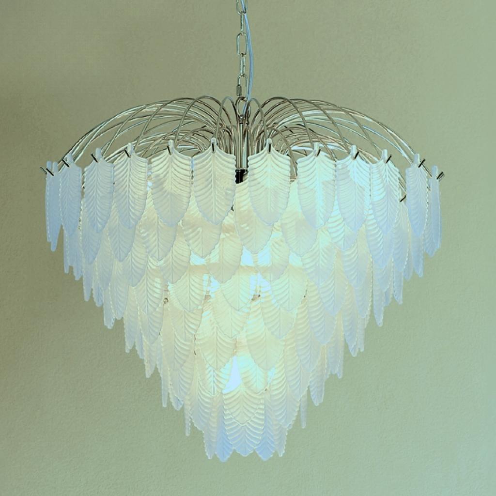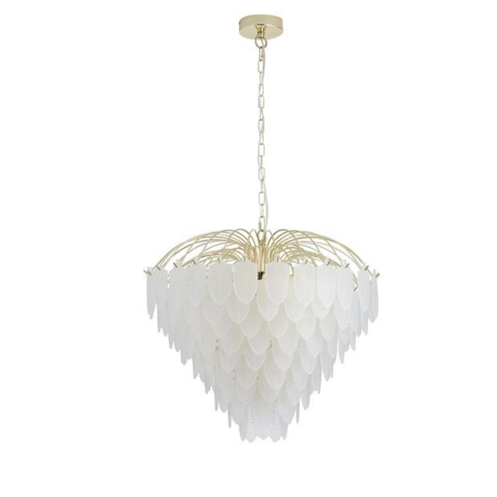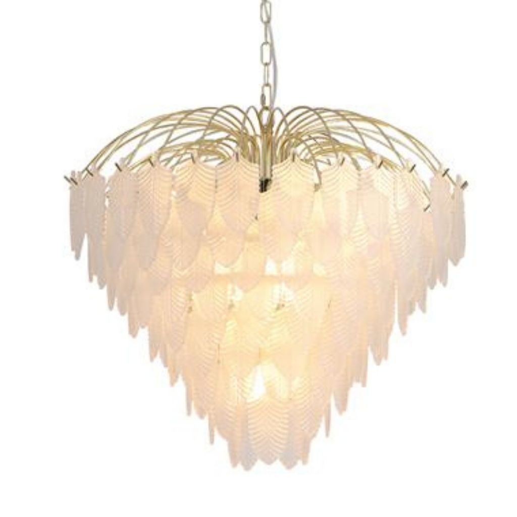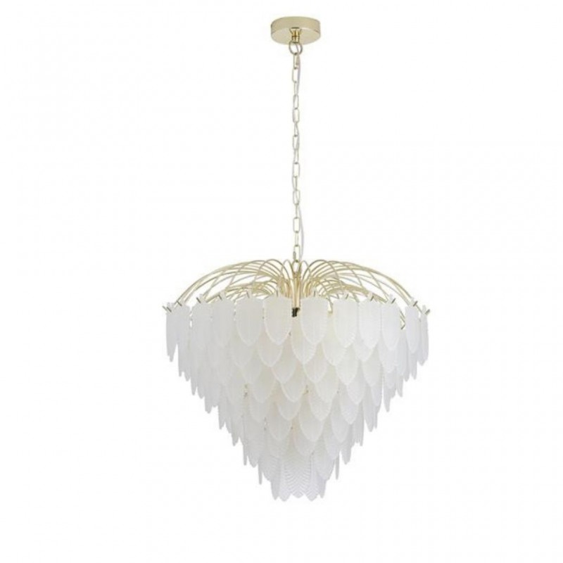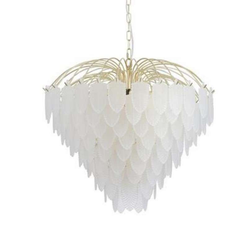 Feather závěsné svítidlo je v luxusním stylu, vyrobené z kovu s povrchovým zpracováním matné mosazi a se skleněnými lístky jako stínidlo. Výška svítidla je 1580 mm, šířka 630 mm, délka závěsu je nastavitelná . Osazeno deseti paticemi typu E14 s maximálním příkonem 10 × 60 W. Svítidlo je stmívatelné, světelné zdroje nejsou součástí balení. Vhodné pro obývací pokoj, jídelnu, ložnici nebo jiné reprezentativní prostory. |
