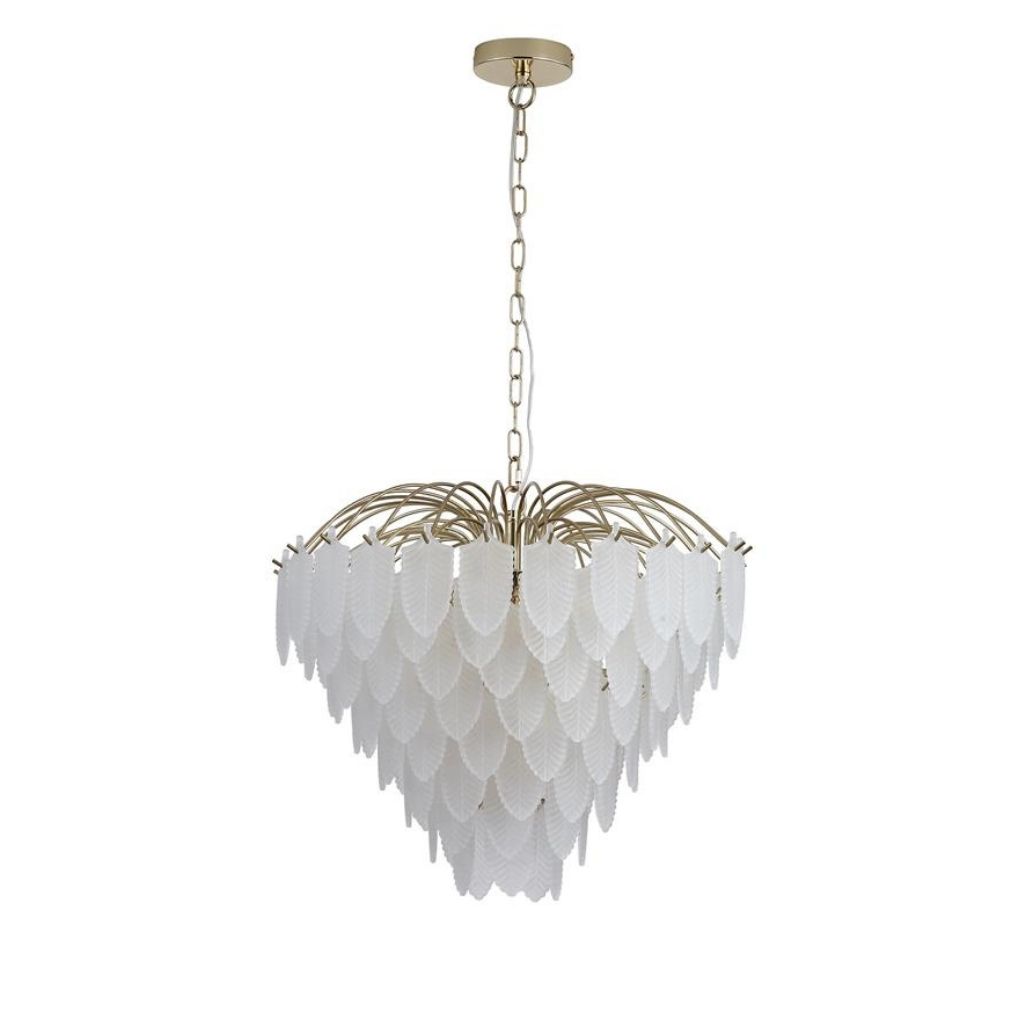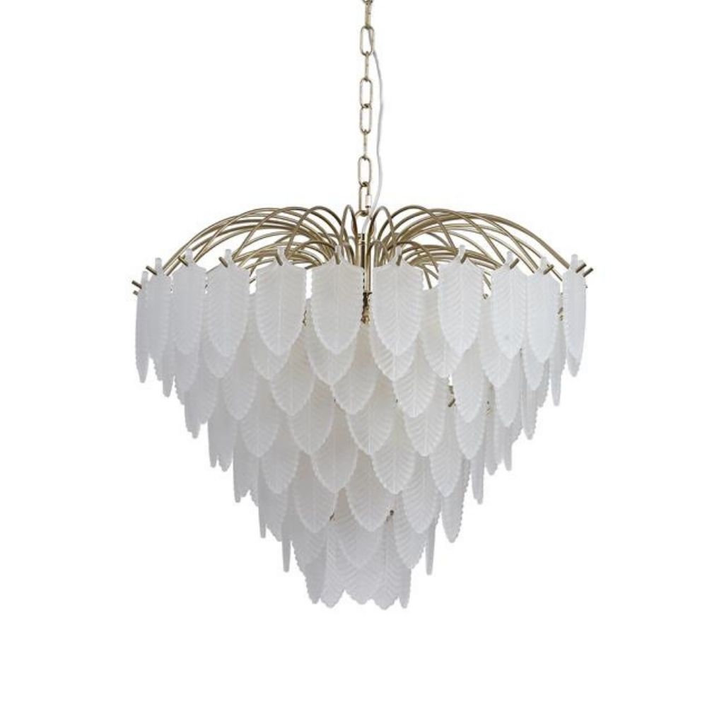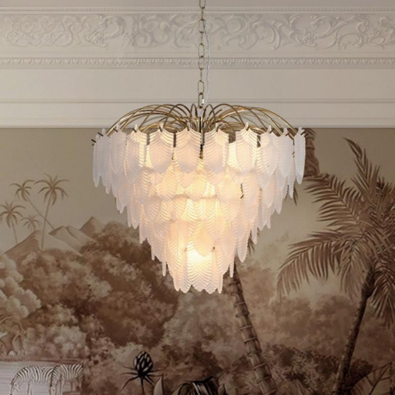 Feather závěsné svítidlo je v luxusním stylu, vyrobené z kovu s povrchovým zpracováním matné mosazi a se skleněnými lístky jako stínidlo. Výška svítidla je 1490 mm, šířka 550 mm, délka závěsu je nastavitelná . Osazeno šesti paticemi typu E14 s maximálním příkonem 6 × 60 W. Svítidlo je stmívatelné, světelné zdroje nejsou součástí balení. Vhodné pro obývací pokoj, jídelnu, ložnici nebo jiné reprezentativní prostory. |