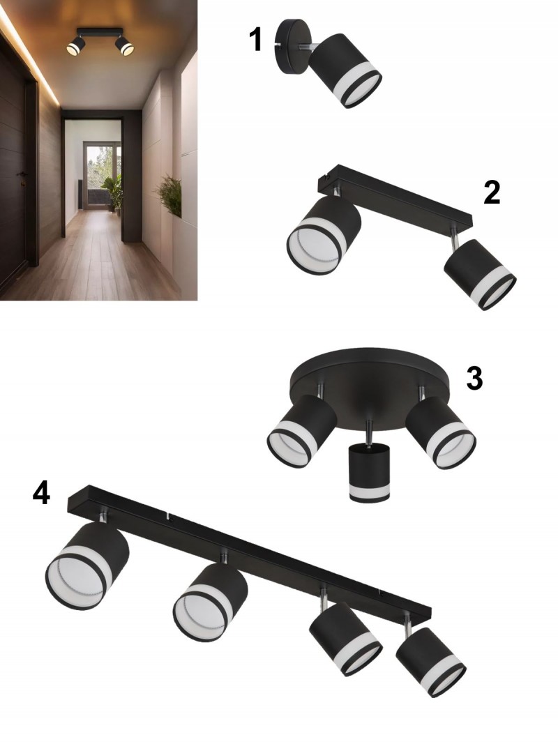 Moderné bodové svietidlá vyrobené z kovu v elegantnej matnej čiernej farbe s bielym plastovým krúžkom. Svietidlá sa dodávajú vrátane LED žiaroviek. Závit GX-53. |