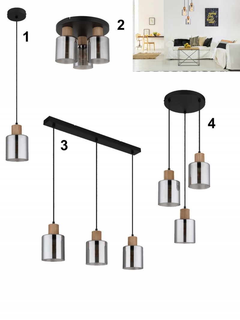 Moderné svietidlá vyrobené z kovu v matnej čiernej farbe a so sklenenými tienidlami v dymovej farbe doplnených o drevený, hnedý prvok. Skvele sa hodí do obývacích izieb, kuchýň, jedální i spální. Svietidlá sa dodávajú bez žiaroviek. So závitom E27. |