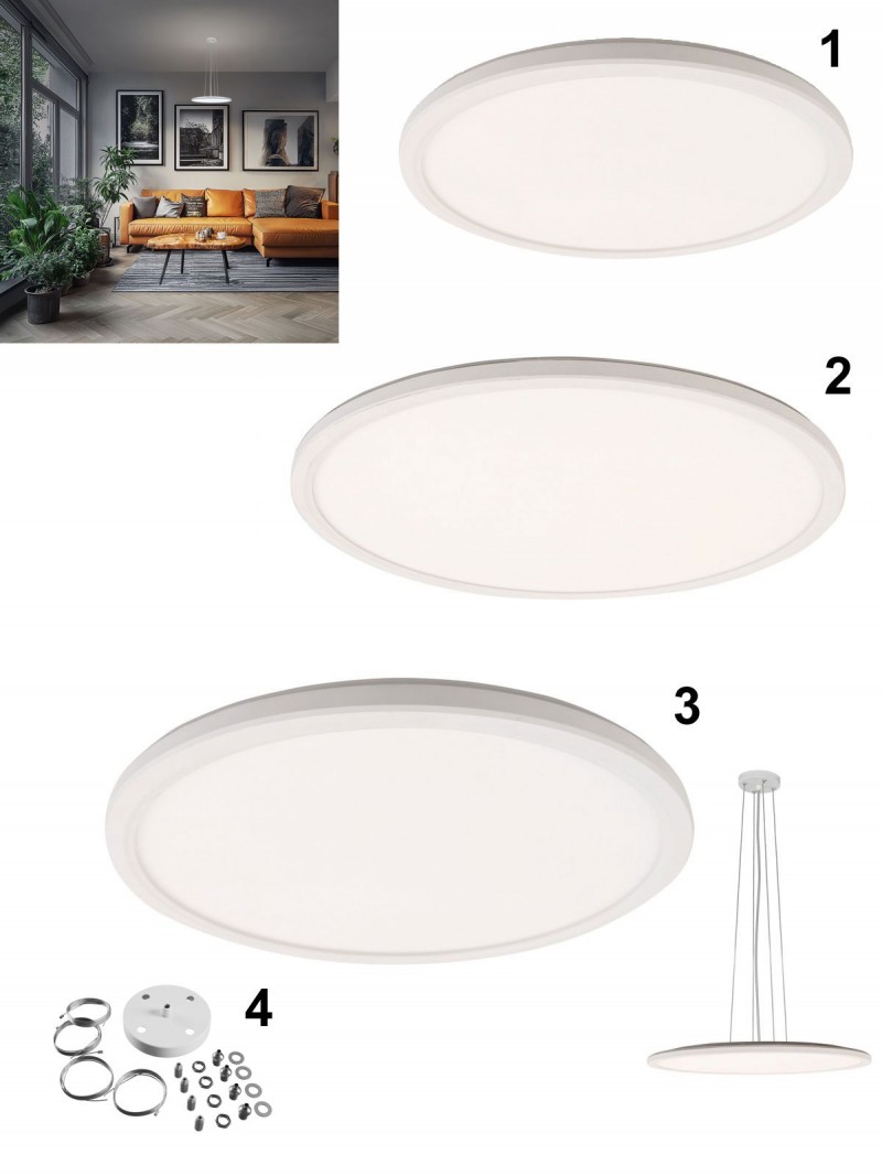 Moderné okrúhle svietidlo vyrobené z plastu v bielej farbe. Vďaka prepínaču je možné nastaviť teplotu svietenia na 3000K/4000K alebo 6000K. Má ochranu IP54, takže je vhodné aj na vonkajšie použitie. Svietidlo pod číslom 2 a 3 je možné dokúpením závesu vytvoriť elegantné závesné svietidlo. |