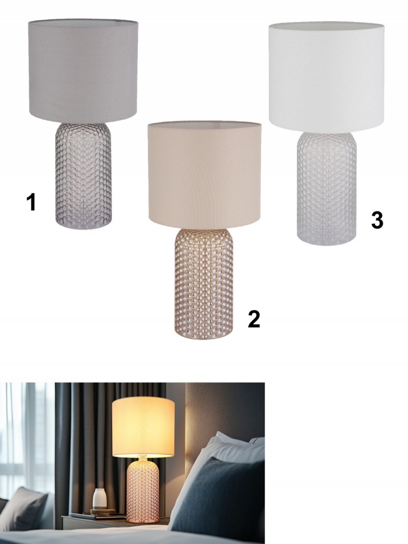 Štýlová stolná lampička vyrobená zo skla a textilného tienidla. Sklenená noha svietidla je dekorovaná, čo jej dodáva zaujímavý vzhľad. Skvele sa hodí do obývacích izieb, spální i predsiení na dotvorenie príjemnej atmosféry. So závitom E27. Žiarovky nie sú súčasťou balenia. Dĺžka kábla 130 cm. |