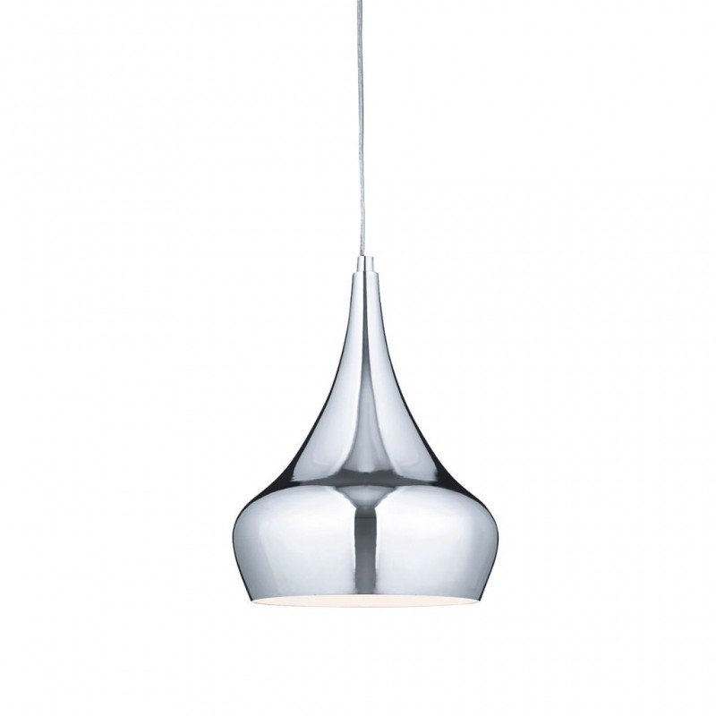 Závěsné svítidlo kovové s povrchovou úpravou lesklý chrom. Uvnitř stínidla bílá barva. Je osazeno paticí E27 a je kompatibilní s LED světelným zdrojem do 10 W. Žárovka není součástí balení. Průměr je 24 cm. Od stropu 135 cm. |