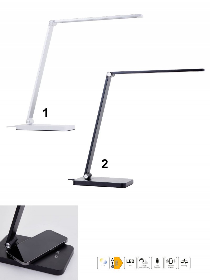 Moderná kancelárska lampička vyrobená z kovu a plastu, ponúka pohodlné bezdrôtové nabíjanie smartfónu priamo na nohe lampičky alebo nabíjanie cez USB kábel. Lampa je vybavená dotykovým spínačom, ktorý umožňuje nastaviť jas v troch úrovniach a dokonale tak prispôsobiť svetlo vašim potrebám. Hlava lampičky je flexibilná a umožňuje Vám nastaviť svietenie presne tam, kam potrebujete. |