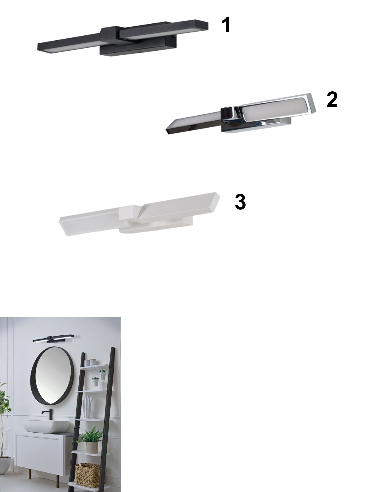 Moderné kúpeľňové svietidlá ARNO sú vyrobené z hliníka s plastovým tienidlom. Hlavy svietidla je možné natáčať. Ochrana proti vlhkosti IP44. Na svietidle je umiestnený prepínač, ktorým je možné nastaviť teplotu svietenia 3000K (teplá biela) alebo 4000K (neutrálna biela). |