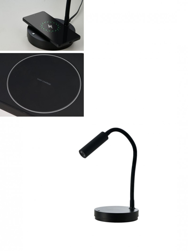Moderná lampička vhodná do kancelárie alebo študentských izieb. Je vyrobená z hliníka, plastu a gumy v elegantnej čiernej farbe. Lampičku je možné stmievať stmievačom umiestneným na základni svietidla. Má tiež funkciu bezdrôtového nabíjania smartfónu. |