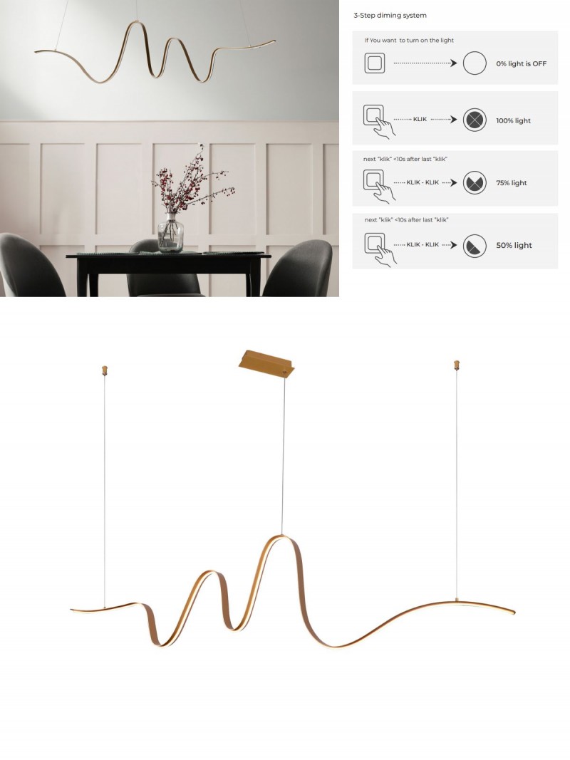 Dizajnové svietidlo Sirocco DIMM je vyrobené z hliníka a silikónového tienidla. Zlatá farba základne dodáva svietidlu elegantný vzhľad. Skvele sa hodí do moderných interiérov. Svieti teplou bielou farbou. LED zdroj je zabudovaný a nie je možné ho meniť. Svietidlo je možné stmievať vypínačom na stene. Jedným klikom svieti 100%, dvojité kliknutie 75%, tromi kliknutiami 50% svietenia. |