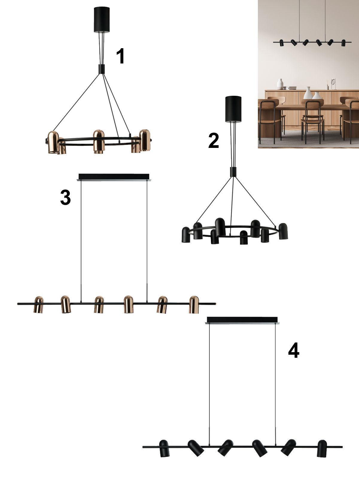 Moderné svietidlá vhodné do kuchyne nad jedálenský stôl alebo do jedálne nad pracovný ostrovček. Skvelým prvkom budú aj v obývacej izbe. Svietili sú vyrobené z hliníka v dvoch farebných variantoch. Čierna a čierna v kombinácii so zlatou. So závitom GU10. |