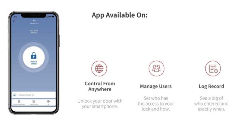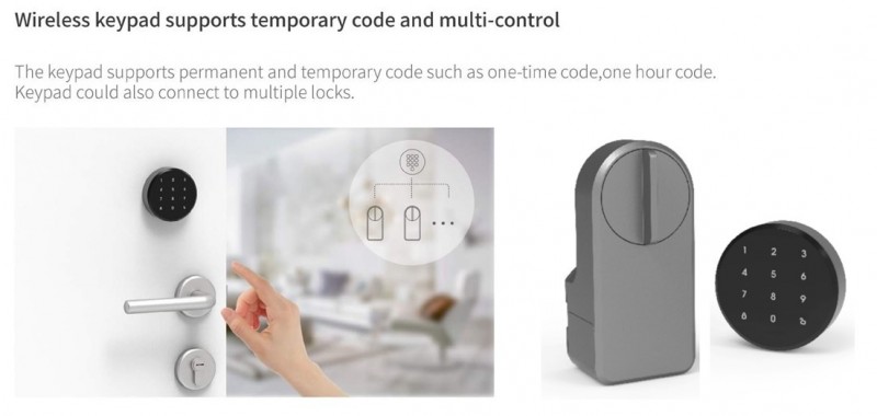Dveřní zámek Barva: šedá Baterie: 4xAA 1,5V baterie (nejsou součástí dodávky) Výdrž na baterii: až 300 dnů Protokol: BLE Frekvence: 2400MHz~2483.5MHz Maximální RF výstupní výkon: BLE: 4dBm Stupeň krytí: IP20 Pracovní teplota: -10 ~ + 55 °C Provozní vlhkost: max 85% RH (bez kondenzace) Rozměr: 13,6 x 6,3 x 4,8 cm Váha bez baterií: 216g