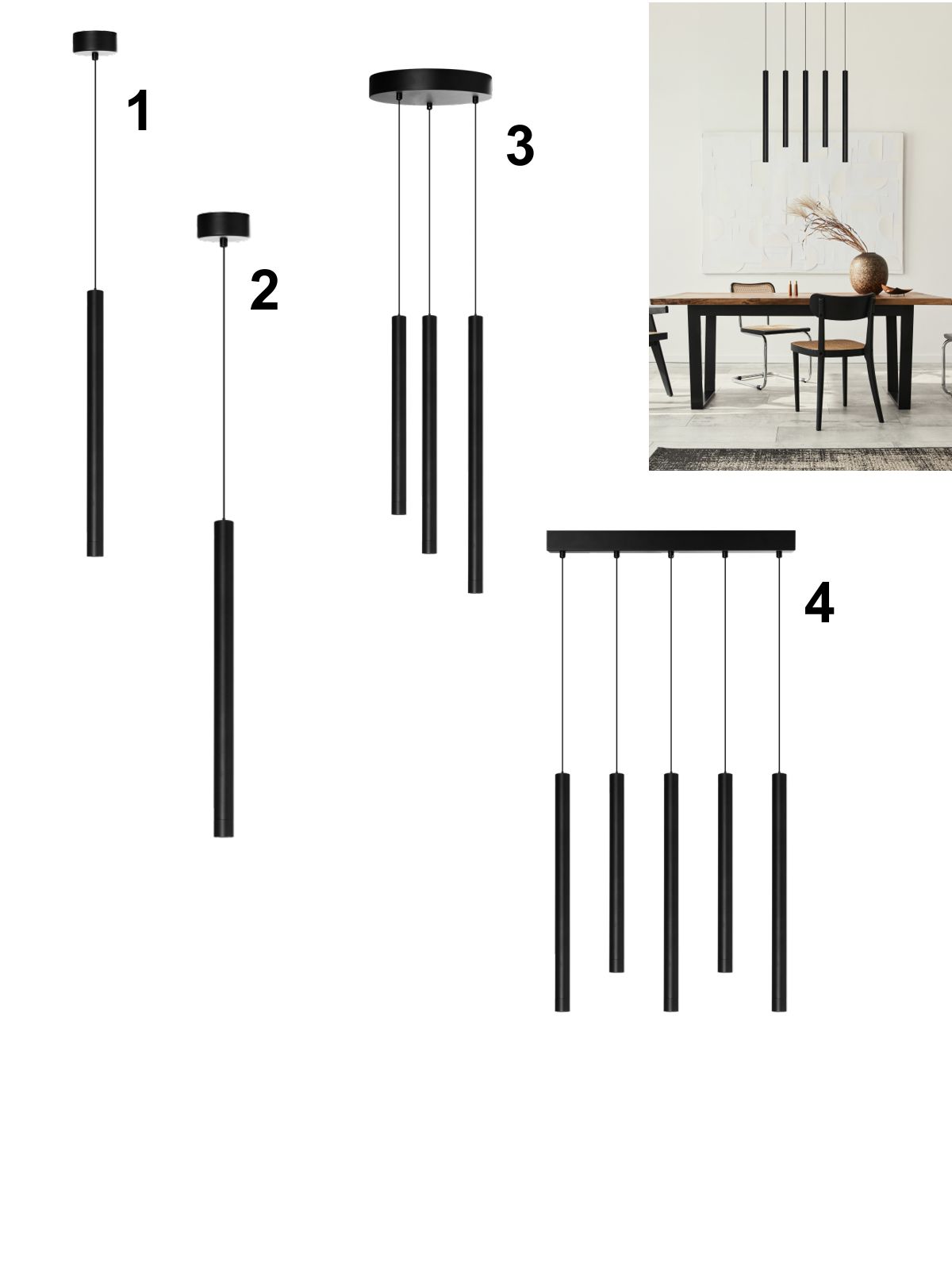Jednoduché elegantné lustre v tvare valca. Sú vyrobené z hliníka v čiernej farbe. LED zdroj je zabudovaný a nie je možné ho meniť. |