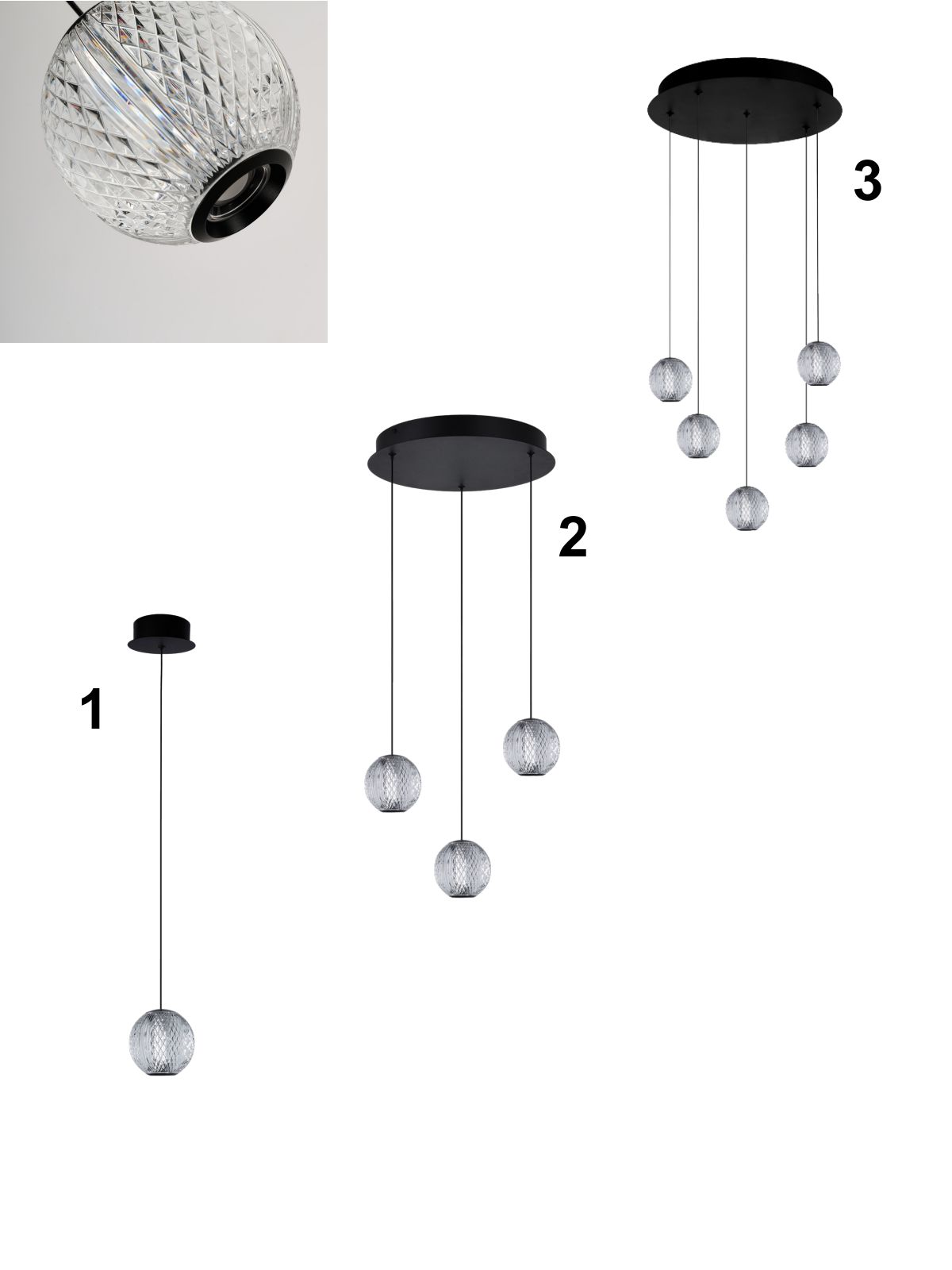 Závesné LED svietidlá vyrobené z kovu v elegantnej čiernej farbe a z akrylového tienidla. Tienidlo má vzhľad brúseného krištáľu. LED zdroj je zabudovaný a nie je možné ho meniť. Svieti teplou bielou farbou. |