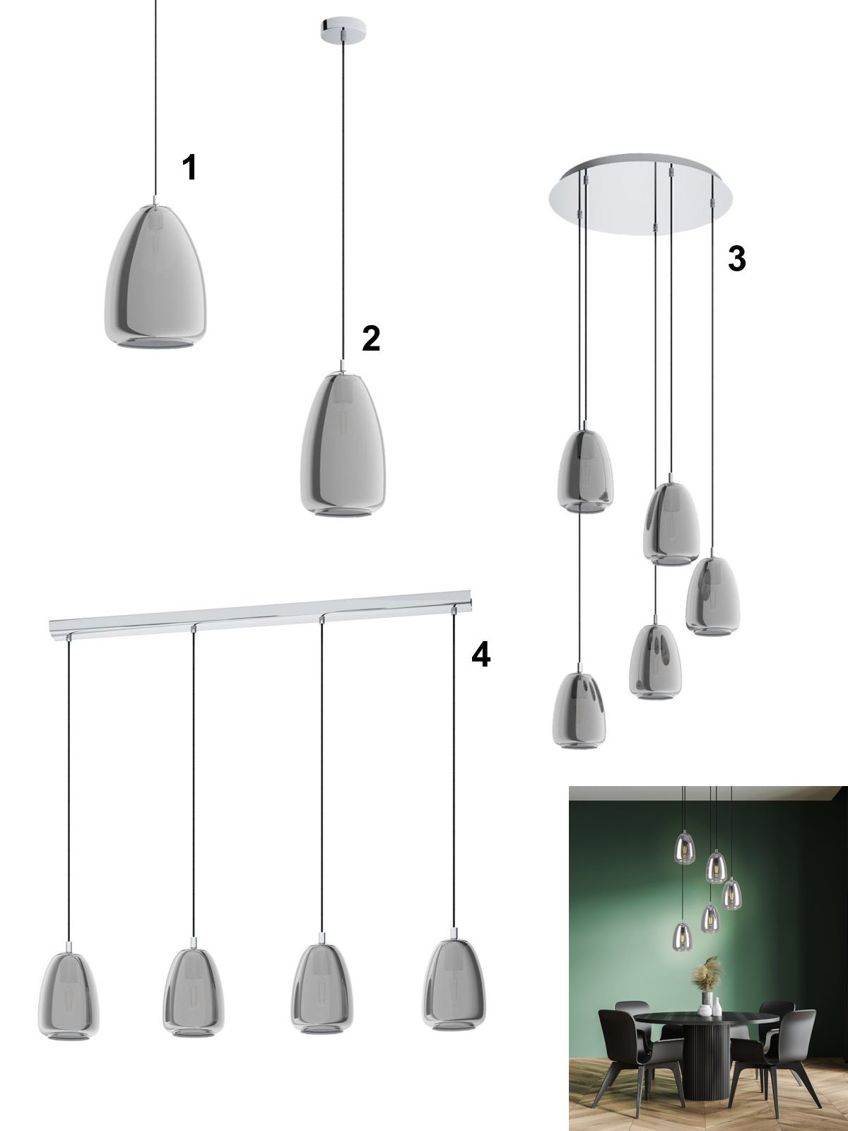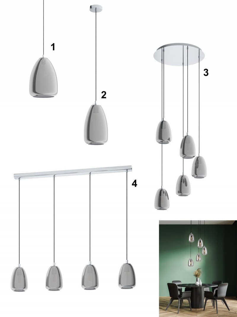 Moderné lustre vyrobené z ocele v chrómovej farbe, tienidlá sú vyrobené zo skla v dymovej farbe. Sú vhodné predovšetkým do kuchýň a jedální, nad jedálenský stôl alebo kuchynský ostrovček. |